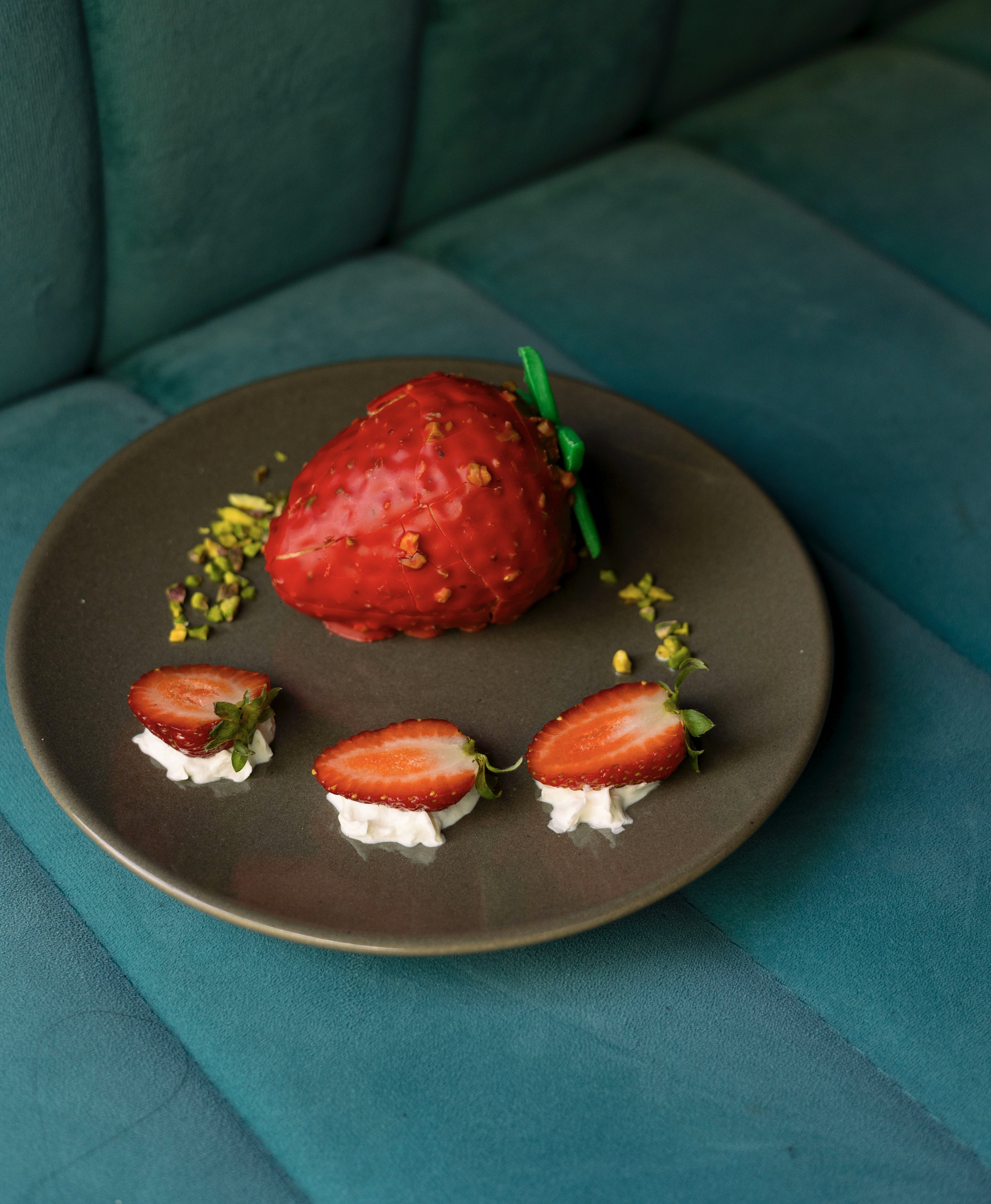 Görünüşüyle şaşırtan, tadıyla büyüleyen bir tatlı. İncecik çilek kabuğu görünümünün altında yumuşak mousse, taze çilek püresi ve çıtır taban gizli.